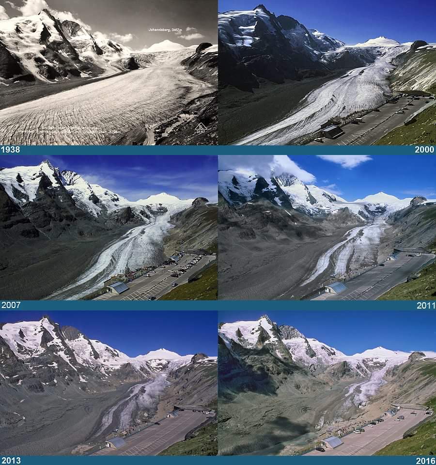 - Deshielo de grandes masas de agua congelada, entre el periodo 1950 – 2000 aproximadamente. A continuación, podemos contemplar la evolución del glaciar de Pasterze, en Grossglockner (Austria), del que se estima su volumen se ha reducido a la mitad desde que hay mediciones (año 1851).