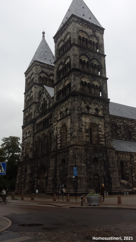 Ahora, cerrando la visita universitaria y de vuelta en el centro, nada nos llamará la atención más que la Catedral de Lund, una abrumadora construcción de la Edad Media cuyas torres alcanzan los 55 metros de altura y junto al edificio principal se encuentra el fórum (un centro para visitantes) y la antigua biblioteca. Sus zonas más antiguas datan del año 1085, y se “acabó” de construir en 1145 aproximadamente. Pongo comillas en la fecha final porque, en esto de construir catedrales, nunca se sabe hasta qué punto se puede dar una por finalizada… Esta catedral, con influencia de la arquitectura italiana de la época y considerada como la mejor representación de arquitectura románica en Escandinavia, ha sufrido varias reformas a lo largo del tiempo, la última, de nuevo por el arquitecto Helgo Zettervall, que rehizo las torres a su gusto y concluyó allá por 1893.