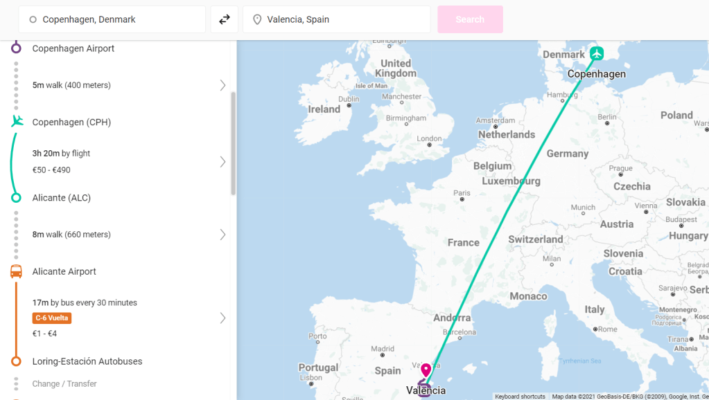 Para el trayecto Copenhague – Valencia, no existe en vuelo directo, pero tomando combinaciones similares (volar a Madrid, Barcelona o Alicante y un transporte adicional hasta Valencia), las opciones quedan en lo económico de la siguiente forma:
