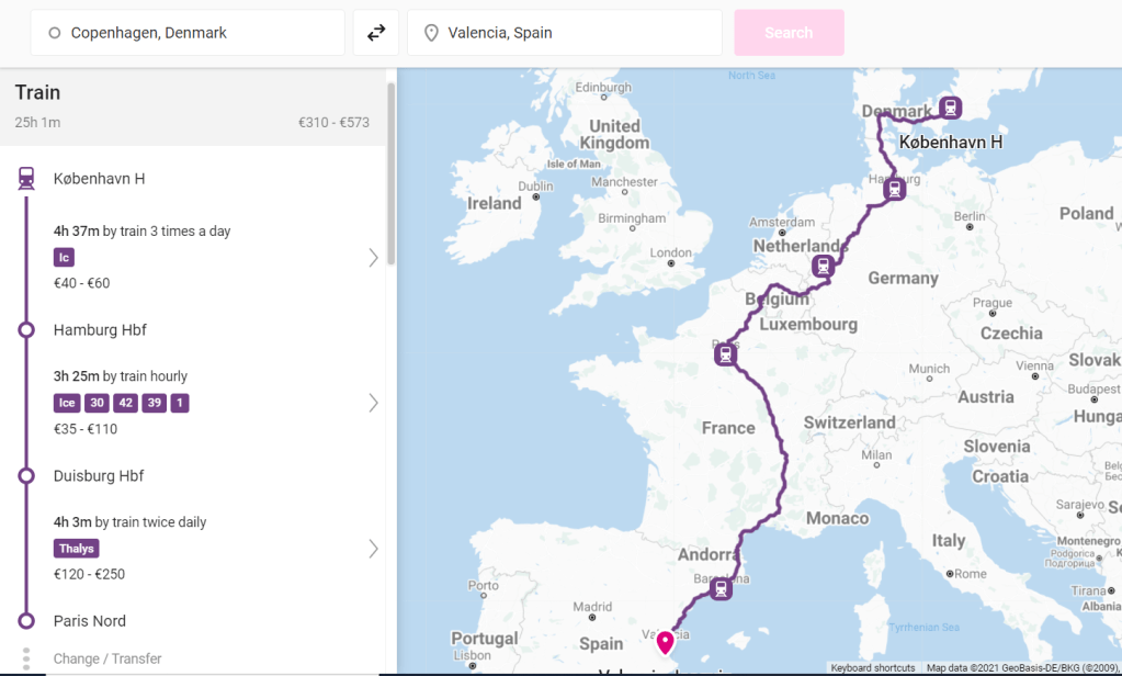 El trayecto en tren Copenhague – Valencia tuvo paradas en Hamburgo, Duisburgo, París y Barcelona. Como el último tramo lo realicé en coche compartido, tomaré como referencia para este cálculo el equivalente a volar hasta Barcelona, descontando el último tramo.