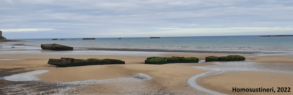 Ubicado en la localidad de Arromanches-les-Bains, aquí las tropas aliadas instalaron un puerto artificial (denominado Mulberry) durante la toma de Normandía, para la provisión de armamento y otros víveres. De ello, todavía quedan en pie varias estructuras: unas bien dentro del mar, a varios kilómetros de la costa, y otras muy cercanas a la playa. Son estructuras de hormigón que flotaban en su día, que pueden tocarse cuando la marea está baja. Se encuentran en un estado semi derruido, y el agua que sale de sus recovecos tiene fuertes tonalidades negras debido a los distintos compuestos que se desprenden.
