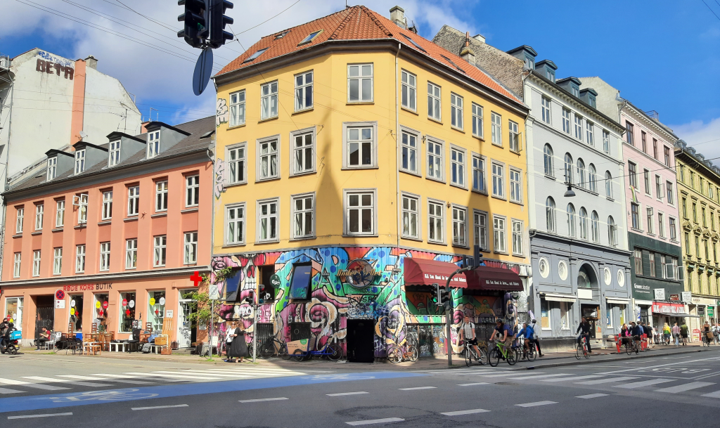 Siguiendo por la misma Nørrebrogade, llegareis a un espacio urbano muy particular: den Røde Plads o la Plaza Roja, que cuenta con bancos, fuentes y otro mobiliario urbano traído de distintas ciudades del mundo, así como un amplio mural urbano junto al centro cultural de Nørrebro. La plaza conecta con den sorte plads (la plaza negra), con su icónico paseo de cebra en cuesta, uno de los enclaves más fotografiados de la Copenhague moderna.