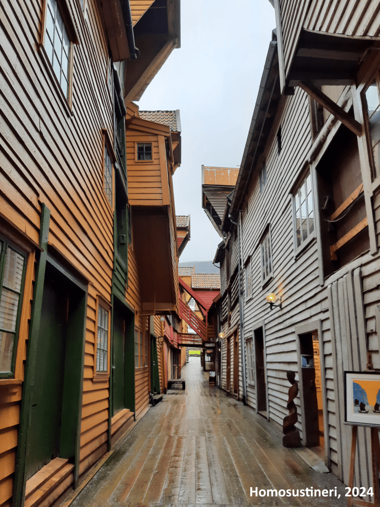 El centro urbano es relativamente menudo, ideal para pasear en medio día y disfrutar de sus calles adoquinadas y pintorescas casas de madera, ya sea por nuestra cuenta o en una visita guiada. Algunas de estas calles tienen bastante pendiente, especialmente en la zona de Bergenhus que sube hacia el monte Floyen. Conviene recordar que las atractivas casas de madera son los hogares de las personas residentes, por tanto, debemos tener esta consideración en cuenta.