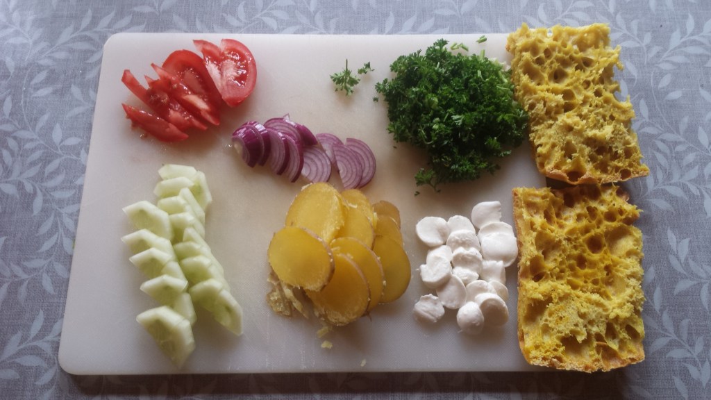 Así, después de abrir la lata, coloqué los arenques sobre una tabla de madera para airearlos, al mismo tiempo preparé tomate en láminas, aguacate, mozzarella, cebolla, perejil, remolaude (o salsa danesa), mantequilla y pan.