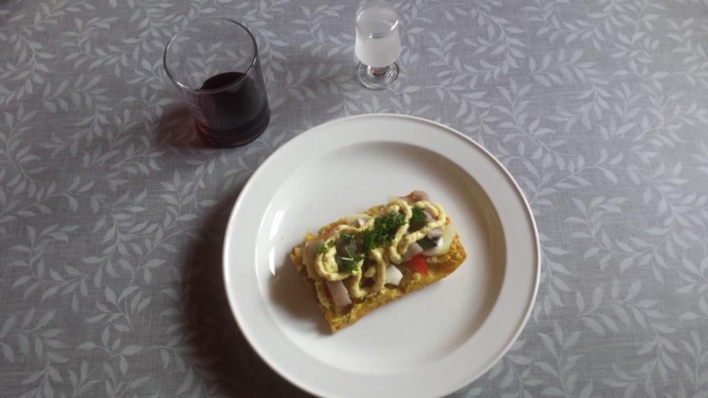 Preparé entonces láminas de pan con varios de estos ingredientes, así como un vasito de vino tinto (uno nunca renegará de sus raíces) y aquavit de Bornholm. Se recomienda no mezclarlo con cerveza, porque tanto gas te puede sentar como un tiro y te toque irte de vareta, con la tía Enriqueta, montada en bicicleta. El resultado final es este: